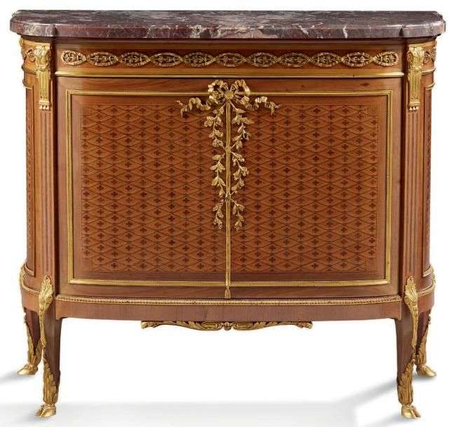 MEUBLE de forme demi-lune en marqueterie à décor de quartefeuille dans des losanges, il ouvre par deux portes en façade.