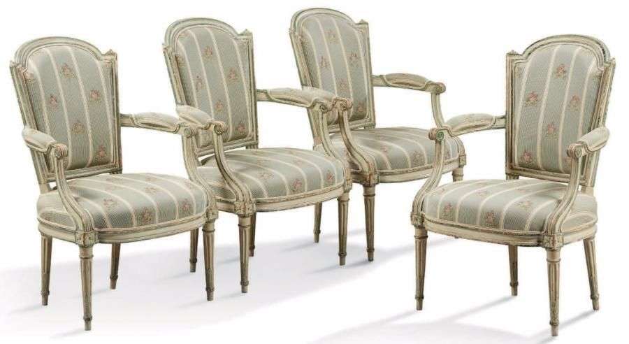 SUITE DE QUATRE FAUTEUILS à dossier cabriolet en bois mouluré laqué crème et rechampi vert. Dés de raccordement à rosace, pieds fuselés à cannelures rudentées.