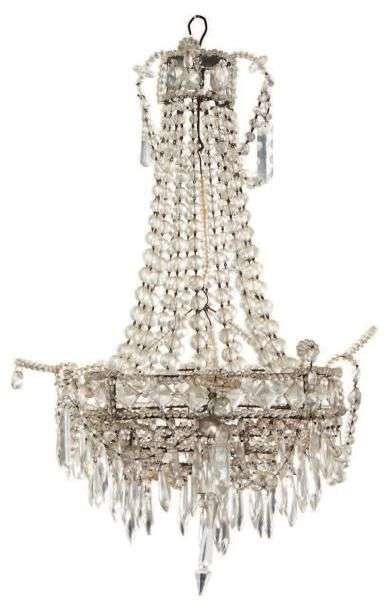 PETITE SUSPENSION corbeille à enfilage de perles et pendeloques en verre.