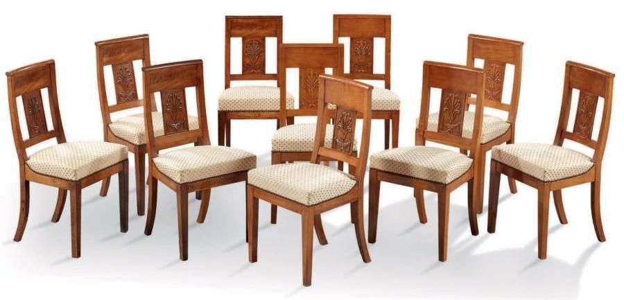 SUITE DE DIX CHAISES en noyer, le dossier à bandeau orné d'une palmette soulignée d'une draperie. Pieds gaine.