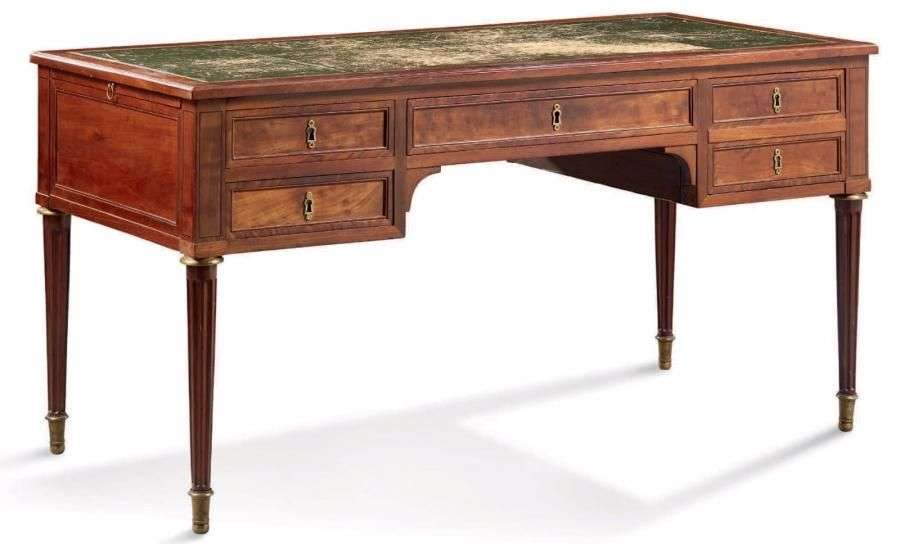BUREAU en acajou et placage d'acajou reposant sur quatre pieds fuselés cannelés. La ceinture se divise en deux caissons à tiroirs, un large tiroir central et deux tirettes sur les petits côtés. Il est garni de cuir vert décoré aux petits fers. Sabots et garnitures en bronze verni.