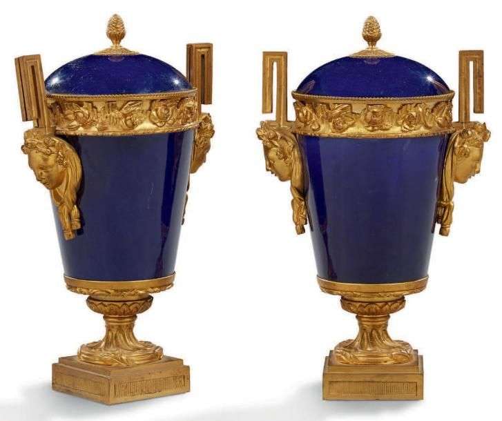 PAIRE DE POTS COUVERTS en porcelaine bleu de Sèvres. Montures en bronze finement ciselées et dorées. Les anses à décor de têtes de femme surmontées de grecques et soulignées d'une draperie. Frises à décor de roses et prises en forme de graine.