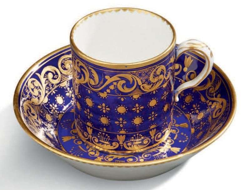 Tasse et sous-tasse en porcelaine à fond gros bleu et décor en or appliqué de rinceaux, palmettes et fleurettes.