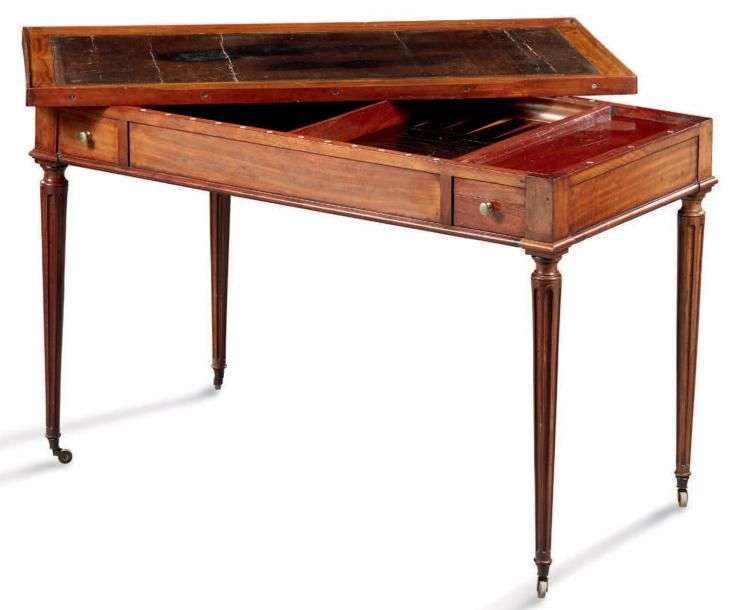 Le plateau amovible est gainé d'un cuir sur une face et découvre le jeu de tric-trac marqueté sur fond d'ébène.