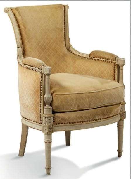 BERGÈRE à dossier renversé, en bois mouluré laqué crème, rechampi jaune. Montants à balustres et pieds fuselés à bagues.