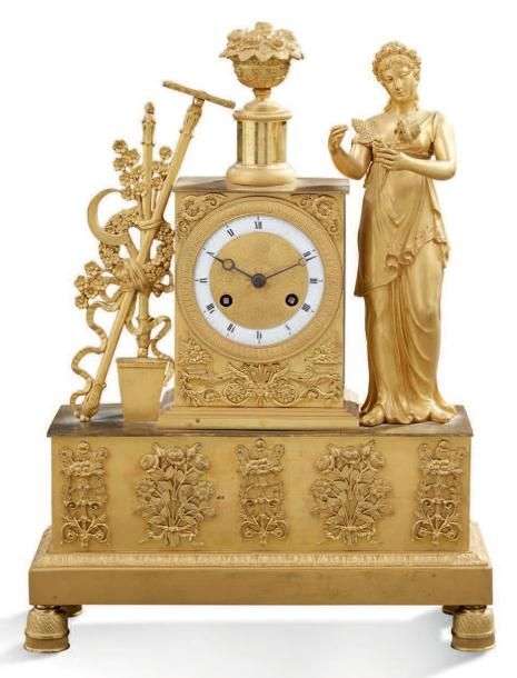 PENDULE en bronze finement ciselé et doré, le cadran émaillé est inscrit dans une borne surmontée d'un pot à fleurs. De part et d'autre, une femme tenant un bouquet et des attributs du jardinage.