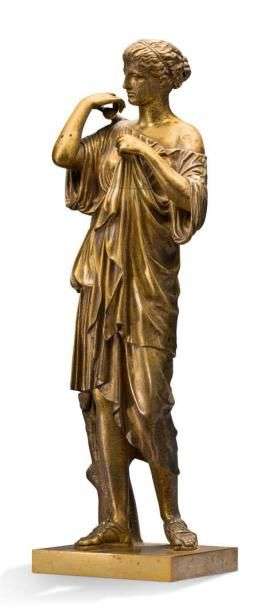 STATUETTE en bronze doré ciselé représentant une femme drapée à l'antique figurant la Diane de Gabies.