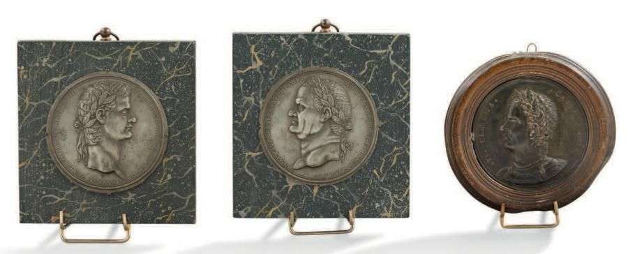 TROIS MÉDAILLONS représentant des profils d'empereurs, deux en étain, un en bronze.
