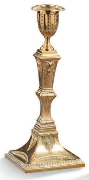 PAIRE DE FLAMBEAUX en bronze ciselé et doré à décor de têtes de chèvre, ra