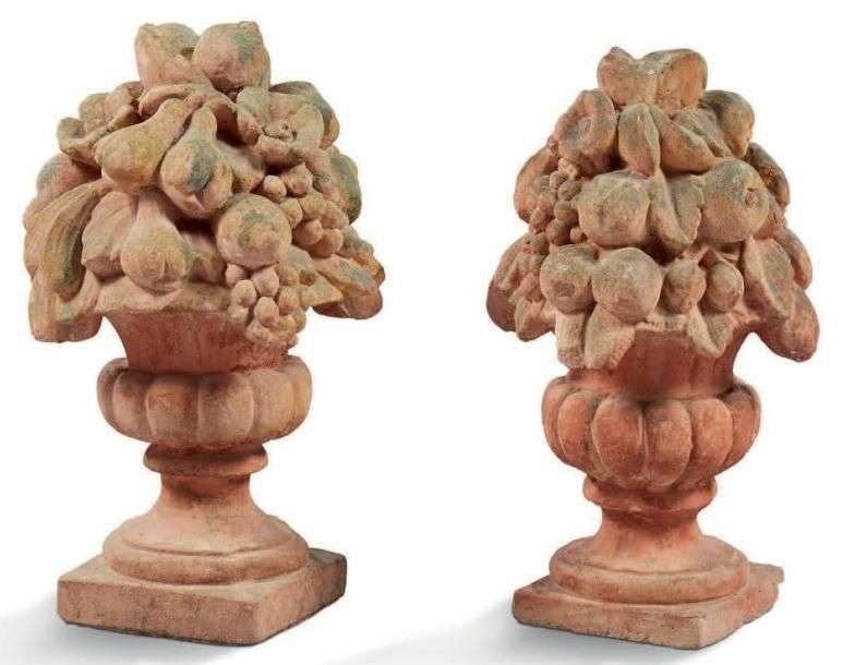 PAIRE DE POTS DÉCORATIFS en pierre reconstituée à motif de fleurs et fruit