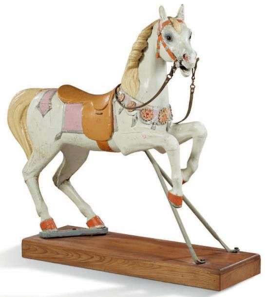 CHEVAL DE MANÈGE en bois relaqué polychrome, les yeux en verre, sur un soc