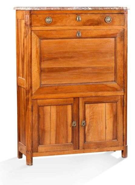 SECRÉTAIRE en bois naturel de forme rectangulaire, il ouvre par un abattant, un tiroir et deux vantaux, montants à pans coupés à cannelures reposant sur quatre pieds droits. Plateau de marbre rose veiné gris.