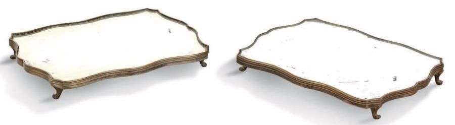 PAIRE DE SURTOUTS DE TABLE en bronze argenté de forme chantournée. Ils reposent sur des petits pieds à godrons.