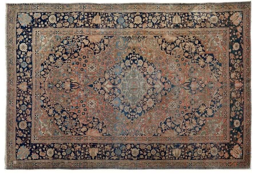 Chaines, trame et franges en coton. Champ corail à ramages de rinceaux et guirlandes de fleurs encadrant un médaillon central floral bleu en forme de diamant. Quatre écoinçons rappelant le médaillon central. Six bordures dont la principale bleu nuit à semis de palmettes fleuries.