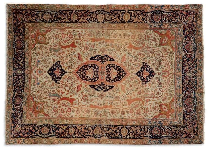 Champ ivoire à rinceaux et guirlandes de fleurs et feuillages encadrant un original médaillon central en forme de diamant allongé bleu nuit et vieux rose orné de deux palmettes. Quatre écoinçons rubis à couronnes de fleurs. Trois