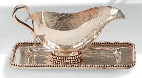 Saucière en métal argenté à fond martelé et frise de perles. Vers 1950. Signée.