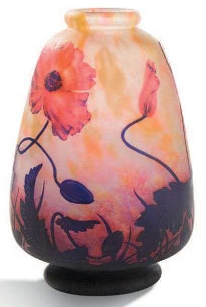 Vase de forme conique à piédouche en verre à décor dégagé à l'acide de coquelicots sur fond blanc nuancé orange.