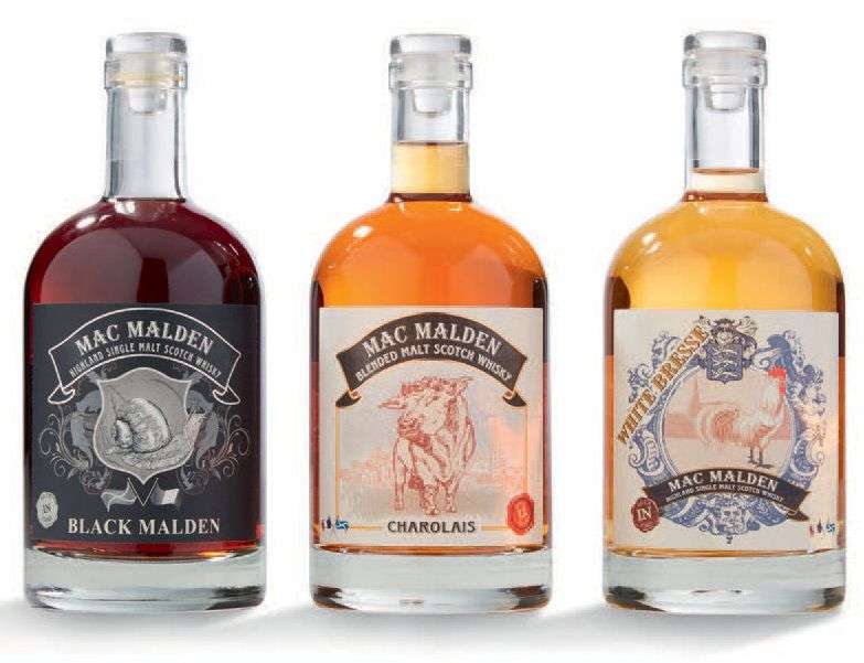 TRILOGIE WHISKY MAC MALDEN 3 lots de 3 blles contenant: 1 blle Mac Malden Black Malden 1 blle Mac Malden Charolais - 12 ans d'êge 1 blle Mac Malden White Bresse 50 cl whisky écossais vieillis en futs de bourgogne par Jean-Luc Maldant vigneron