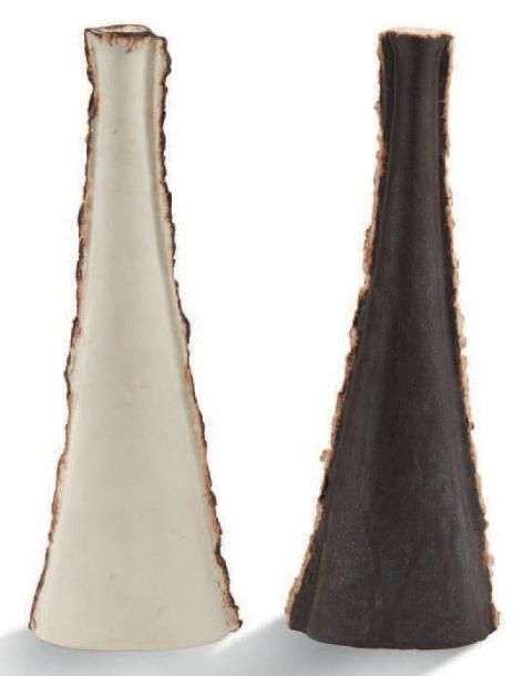 Paire de soliflores en céramique émaillée brune. Signées Gambone Italie