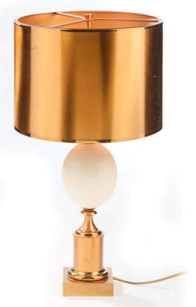 Lampe en laiton doré enserrant un oeuf d'autruche à abat jour circulaire en laiton doré. Signée. H: 64 cm