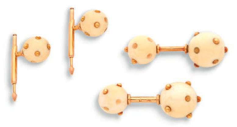 Paire de boutons de manchettes et boutons de col en or jaune 18k et boules en ivoire et or jaune. Signés