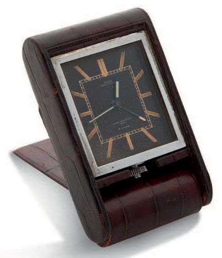 Ados. Réveil de voyage 8 jours gainé de cuir marron. Cadran noir Art-Deco, aiguilles et index bâtons squelettes.