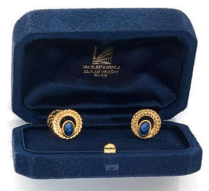 Paire de boutons de manchettes en or jaune 18K (750) tressés rehaussé d'un saphir cabochon. Signés. Dans leur écrin.
