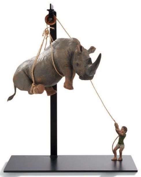 Sculpture en bronze peint, métal et corde, signée, datée et numérotée 3/8 sur la pâte gauche arrière du rhinocéros