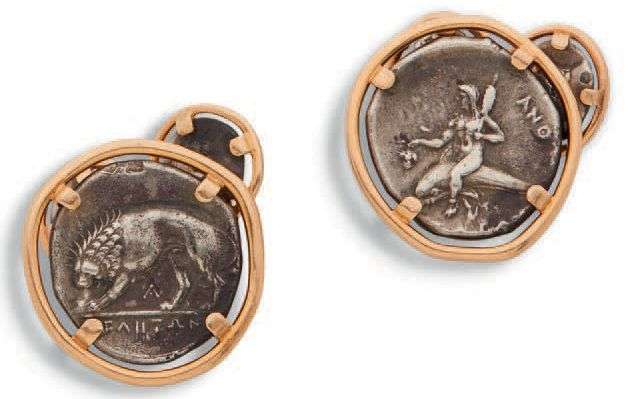 PAIRE DE BOUTONS DE MANCHETTES formés de pièces antique en argent (<800).