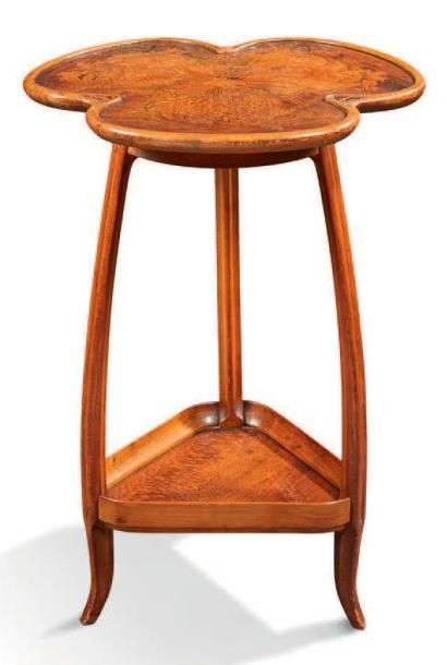 Petite table d'appoint en noyer de forme trilobée à plateau marqueté d'une fleur reposant sur un piétement cambré nervuré tripode enserrant un plateau d'entretoise triangulaire. Signée. Vers 1900