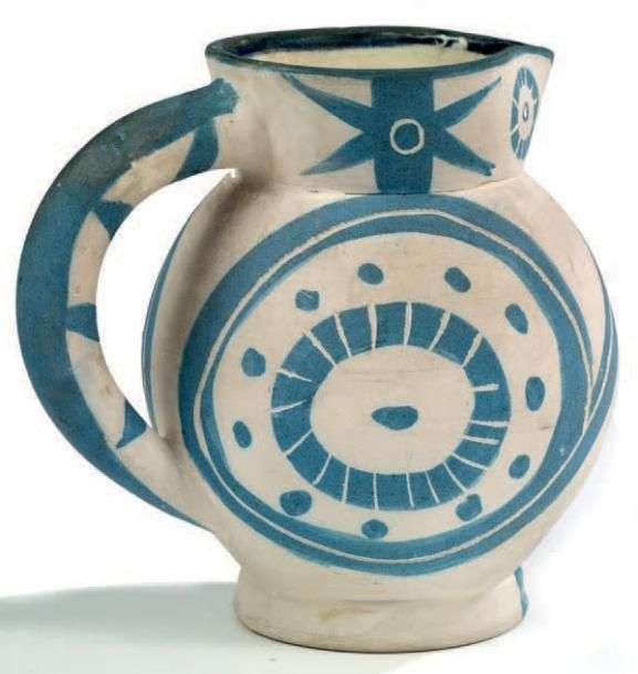 Pichet modèle «Petite chouette» en terre de faïence blanche et bleue. Signé des cachets en creux Madoura Plein Feu et cachet Edition Picasso. Vers 1949.
