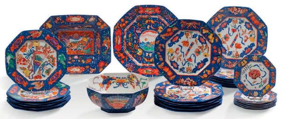 Important service «Marqueterie de Pierres d'orient et d'occident» comprenant: 3 plats de service, 6 assiettes à dessert, 6 assiettes à entremet, 12 assiettes de table.
