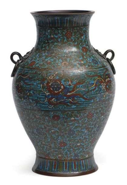 Vase balustre en bronze et émaux cloisonnés polychromes sur fond bleu, à décor couvrant de rinceaux floraux, la panse soulignée d'une large bande ornée de phénix stylsiés, l'ouverture et la base cernées d'une frise de pétales de lotus stylisés, l'épaule rehaussée de deux masques tenant des anneaux mobiles. Marque sur la base.