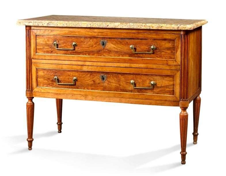 Commode sauteuse en bois naturel, décor de réserve, ouvrant à deux tiroirs, reposant sur des pieds fuselés et cannelés