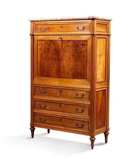 Secrétaire en bois naturel ouvrant à quatre tiroirs et un abattant, relevé de filets de laiton. L'abattant en maroquin rouge ouvre sur des casiers et six petits tiroirs.