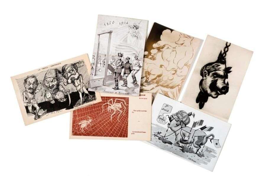Environ 290 cartes patriotiques , caricatures en noir et blanc et sépia