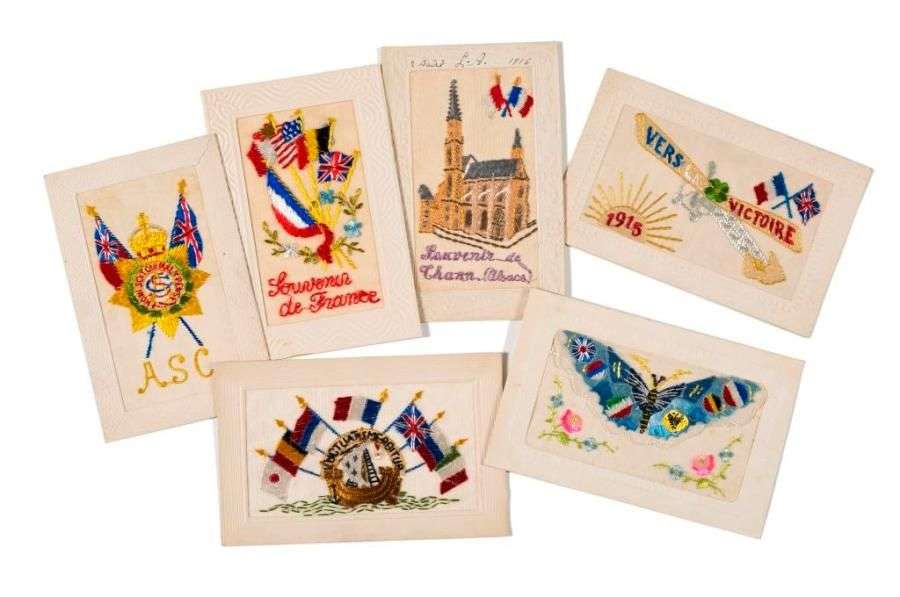 Environs 170 cartes à sujets patriotiques (drapeaux, millésimes, décorations, matériel…)