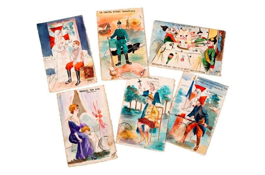 Environ 48 cartes peintes à l'aquarelle (anti allemandes, infirmières de la Croix Rouge)