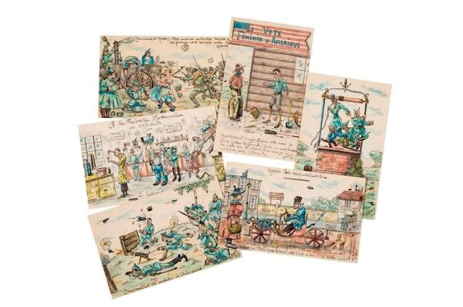 Environ 70 cartes peintes à l'aquarelle à sujets humoristiques