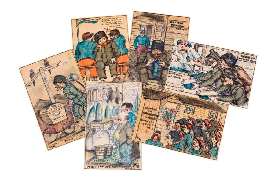 Environ 25 cartes dessinées représentant des soldats Russes et Français dans des camps de prisonniers