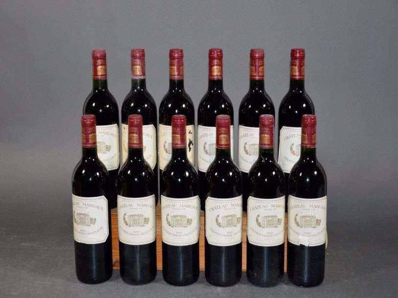 12 B CHÂTEAU MARGAUX (Caisse Bois sans couvercle) 6 e.t.h. légères dont 4 e.l.a| 2 e.t.a| quelques c.s. à c.c. légères| 1 c.c| 4 avec accrocs bas de jupe| 1 avec 1 accroc léger sommet GCC1 Margaux 1989