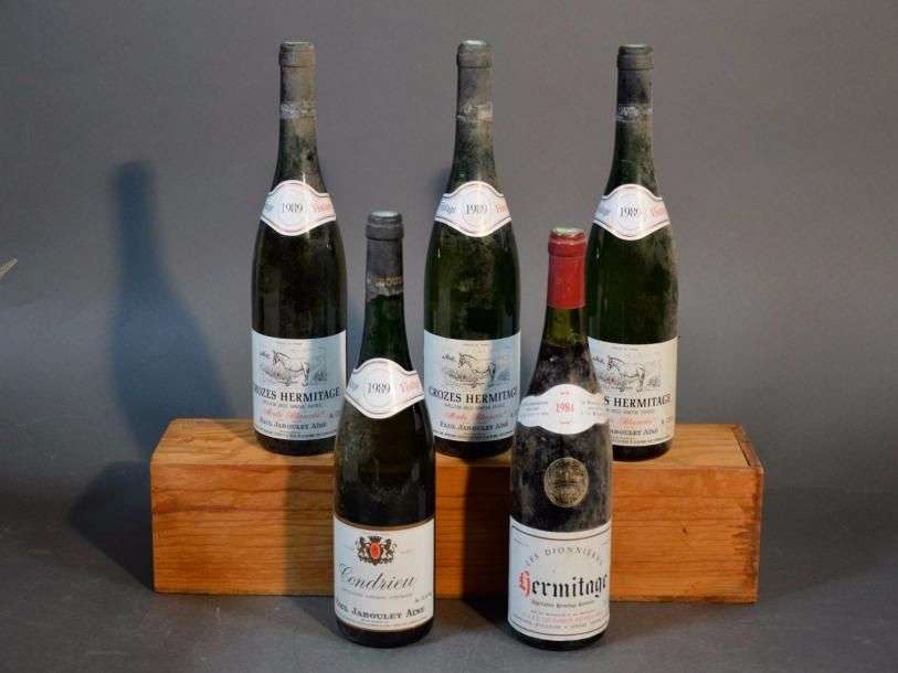 3 B CROZES HERMITAGE LA MULE BLANCHE (4 cm ou mieux| e.l.s| 2 c.s| 1 c.c.) Jaboulet Ainé 19891 B CONDRIEU (4,2 cm| e.l.s| c.c. légères) Jaboulet Ainé 19891 B HERMITAGE LES DIONNIÈRES (e.l.s| clm.s| c.l.a. côté) Gamets Fayolle Fils 1984