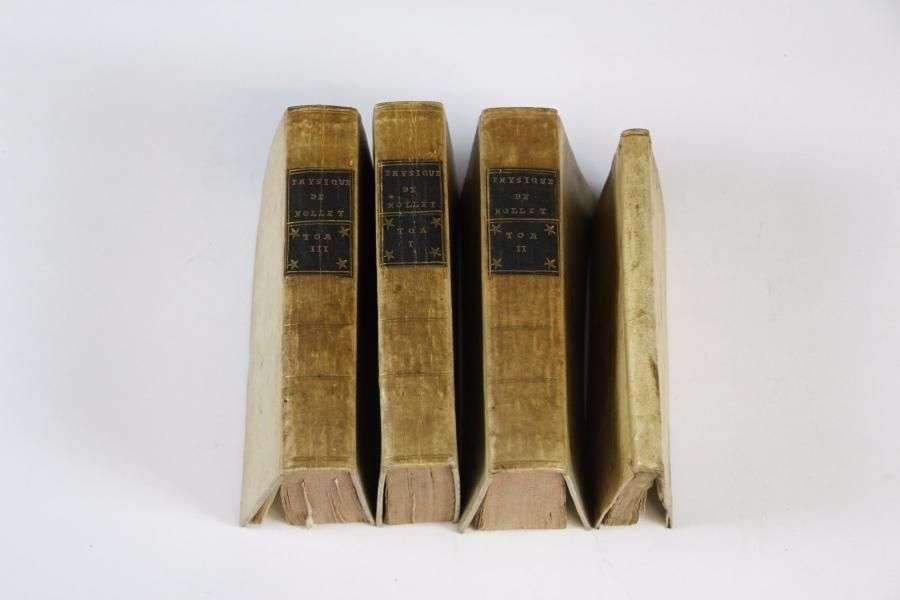 Lot de 4 livres : M. l'Abbé Nollet L'art des expériences, ou avis aux amateurs de la Physique. A Paris chez P.E.G Durand, 1770. 3 tomes | Derodon David, professeur en philosophie en l'académie d'Oranges L'athéisme convaincu. Traité démontrant par raisons naturelles qu'il y a un Dieu. 1659. Couverture en vélin blanc, Ex libris P. Couturier de Royas.