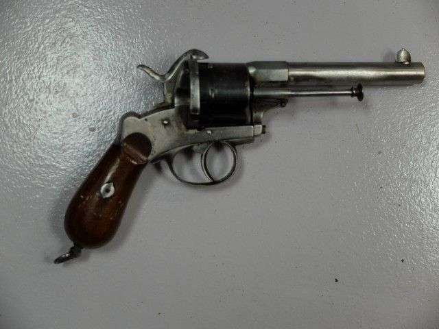 Revolver, à broche. 6 coups, calibre 12 mm. Barillet bleui. Plaquettes de crosse en noyer.