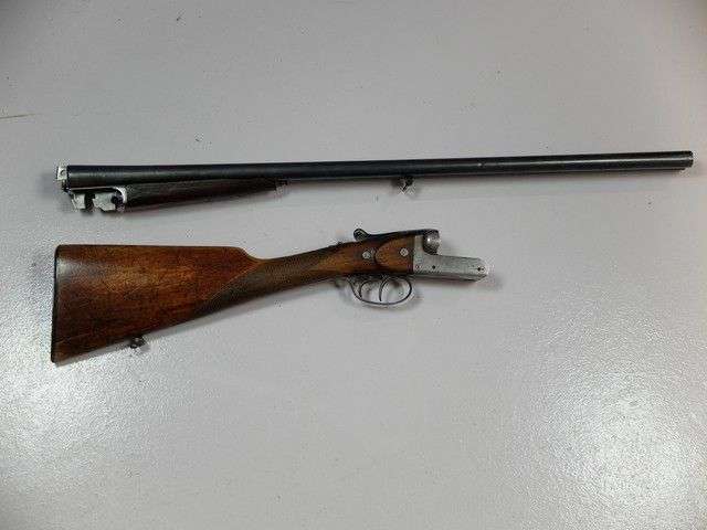 Fusil stéphanois, modèle hammerless. 2 coups, calibre 16/65, extracteur. Canons juxtaposés de 70 cm. Crosse en noyer, de 35,5 cm. (dans l’état) Dans un étui jambon en cuir. Catégorie D1 soumise à enregistrement L’acquéreur devra présenter OBLIGATOIREMENT la carte d'identité et le permis de chasser français uniquement, en cours de validité (2017/2018) ou licence de tir française uniquement, en cours de validité. Pour les personnes étrangères n’ayant pas ces papiers, ils devront se faire représenter par un armurier français pour l’achat.