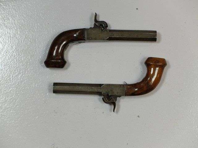 Paire de pistolets à coffre à percussion. Canons à pans. Détentes rentrant