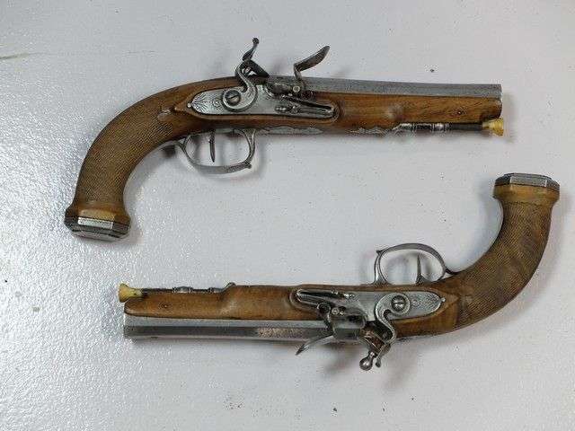 Paire de pistolets stéphanois à silex modèle d'officier. Canons à pans éva