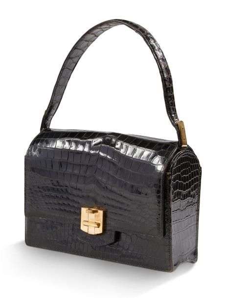Sac en crocodile d'estuaire noir (Crocodylus porosus). garniture en métal plaqué or, doublure en agneau plongé noir à un soufflet comprenant une poche à fermoir pression, une double poche plaquée, poignée.