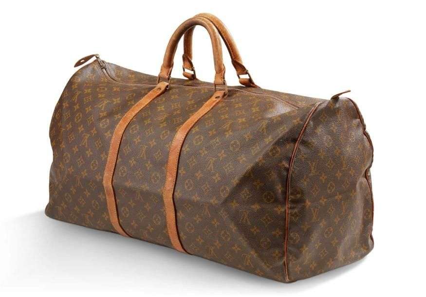 Sac "Keepall" 60 cm en toile monogrammée et cuir naturel. Fermeture éclair, double poignée, garniture en laiton doré