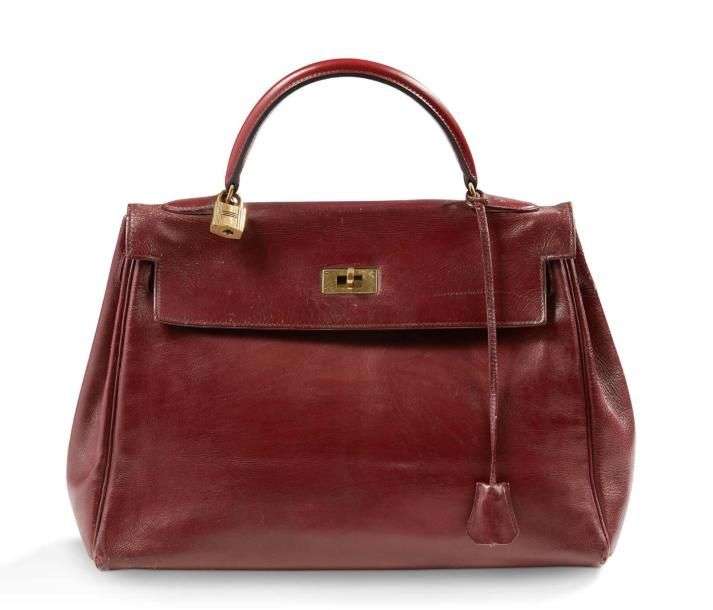 Sac Kelly cuir bordeaux. Garniture en métal doré. Anse en suir permettant un portage main. Avec ses clefs et son cadenas. Intérieur en cuir comprenant une double poche plaquée et une poche zippée.